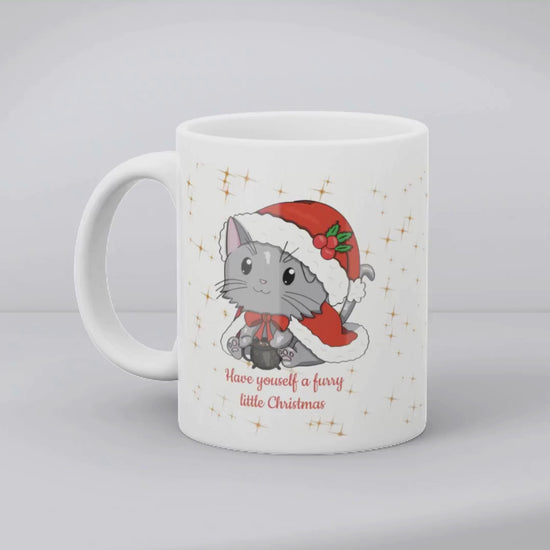 1 A6-Karte – Vorderseite mit Katzen-Illustration und Spruch "Have yourself a furry little Christmas", Rückseite blanko. Mit rotem Briefumschlag