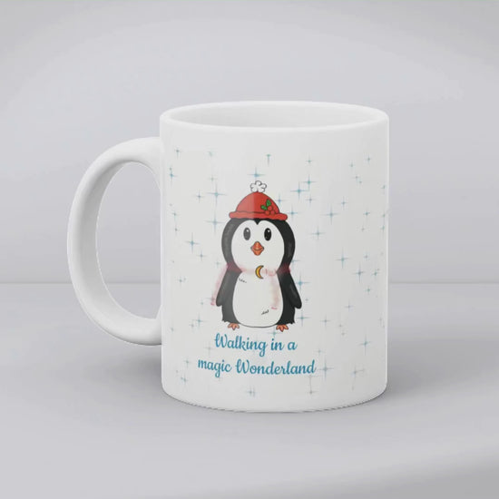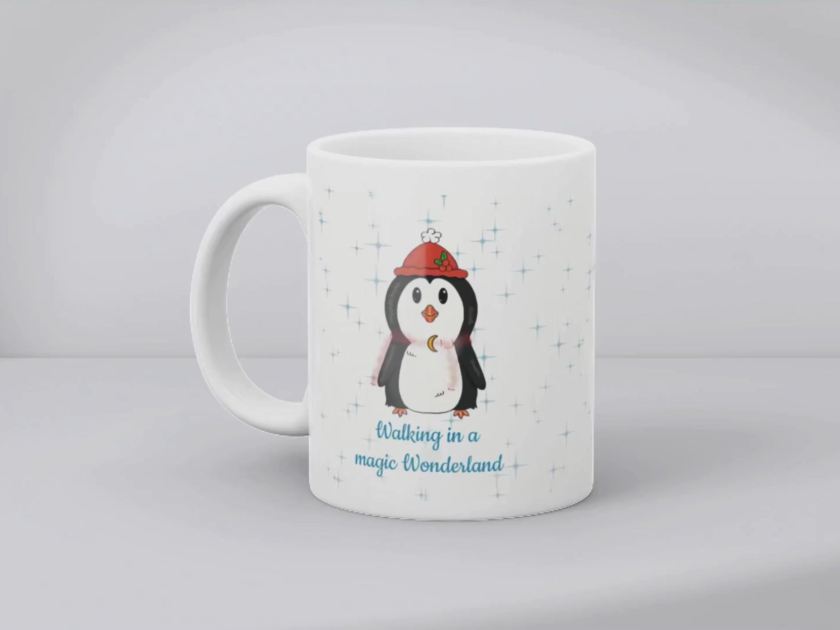 1 A6-Karte – Vorderseite mit Pinguin-Illustration und Spruch "walking in a magic wonderland", Rückseite blanko. Mit rotem Briefumschlag