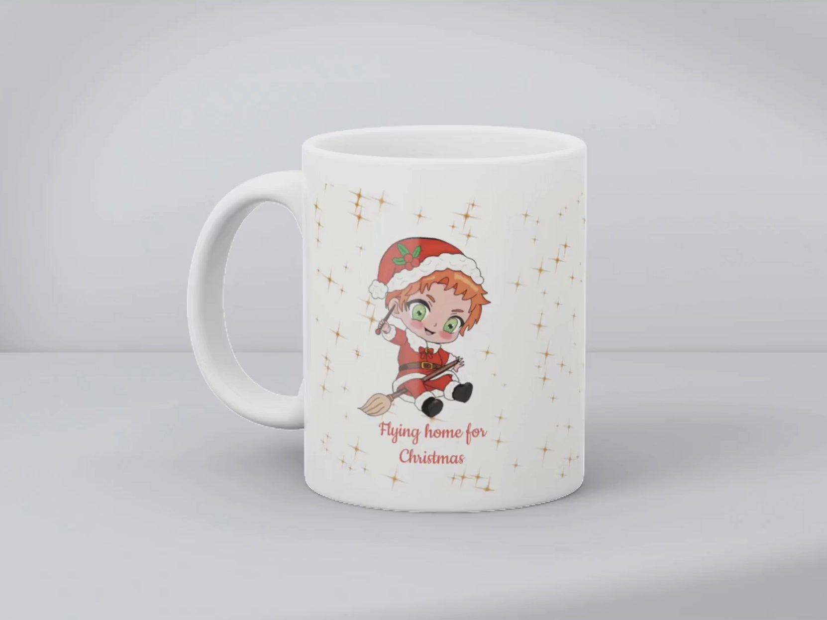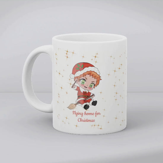 2 A6-Postkarten Magier, Vorderseite mit Illustration und Spruch: "Flying home for christmas", Rückseite blanko
